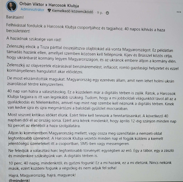 Most 58 900 tagja van a csoportnak, és a miniszterelnök legutóbbi posztja mintha nem arról árulkodna, hogy olyan magabiztosak. „Felhívással fordulok a Harcosok Klubja csoportjához és tagjaihoz. 40 napos kihívás a haza becsületéért!” - kezdi Orbán és eddig még rendben is van a dolog. Zelenszkij, olajvezeték, beszólogatás Ukrajnának - ebben sincs meglepő. Majd rátér a lényegre: